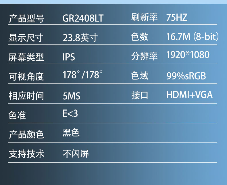 屏幕比例:16:9接口类型:HDMI VGA DC垂直可视角度:178°