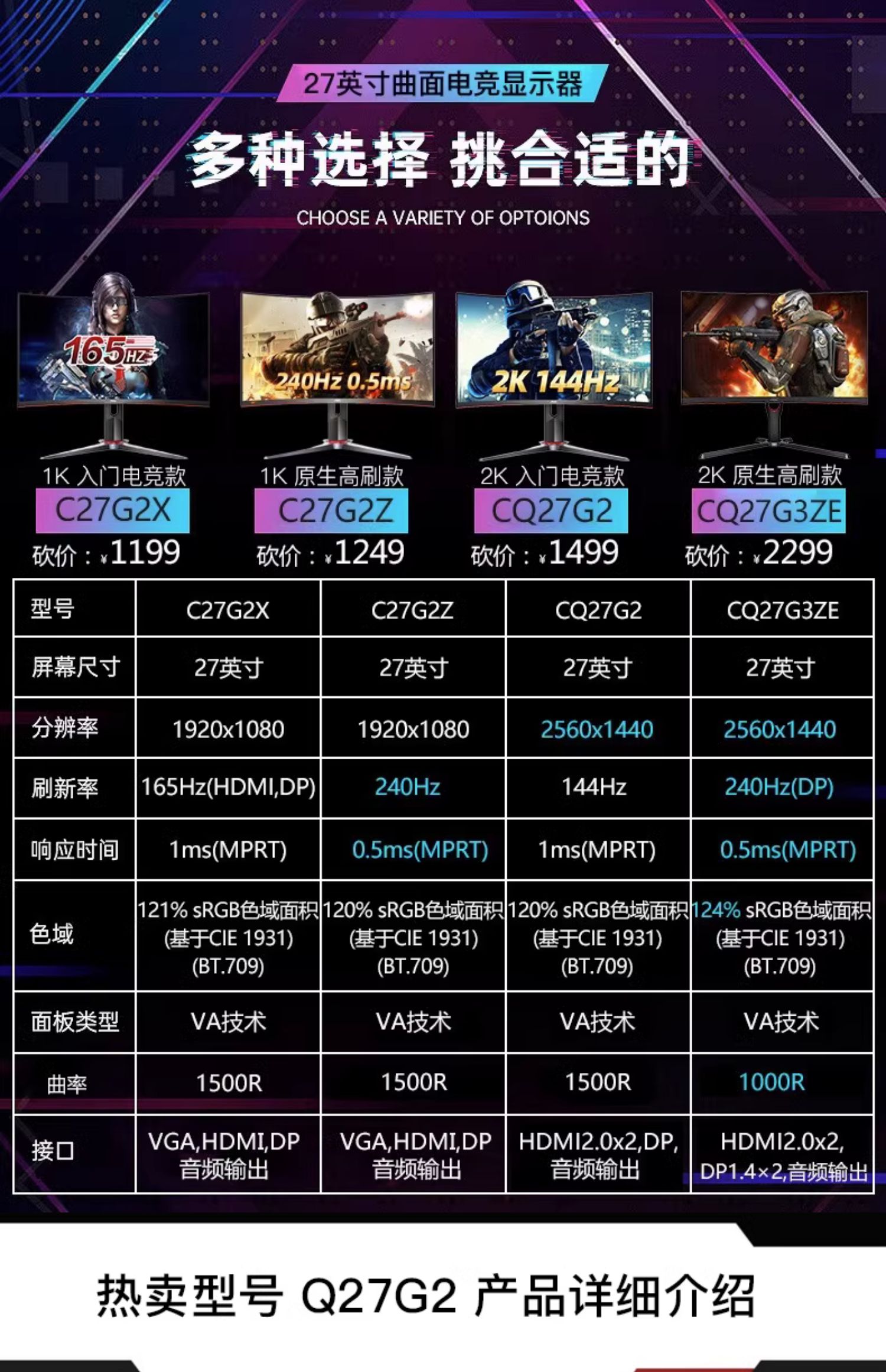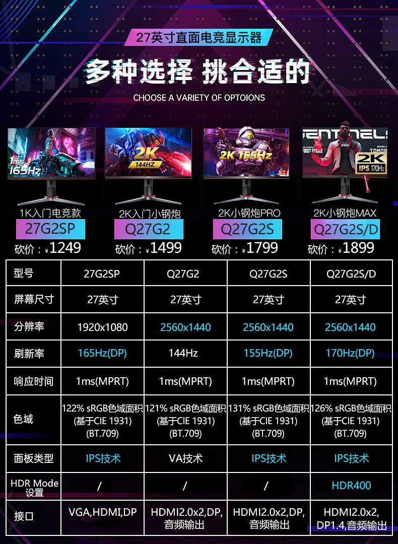 黑白响应时间:1毫秒灰阶响应时间:1毫秒颜色分类:27B1H 1K 60Hz 家用公办IPS直面屏 G2790VX/BS 1K 144Hz 入门电竞直面 27G2SP 1K 165Hz IPS性价电竞直面款 C27G2X 1K 165Hz 1ms入门电竞曲面款 C27G2Z 1K 240Hz 原生高刷曲面款 27G2Z 1K 240Hz 高刷直面款 CQ27G2 2K 144Hz 入门电竞曲面款 Q27G2 2K 144Hz 直面电竞小钢炮款