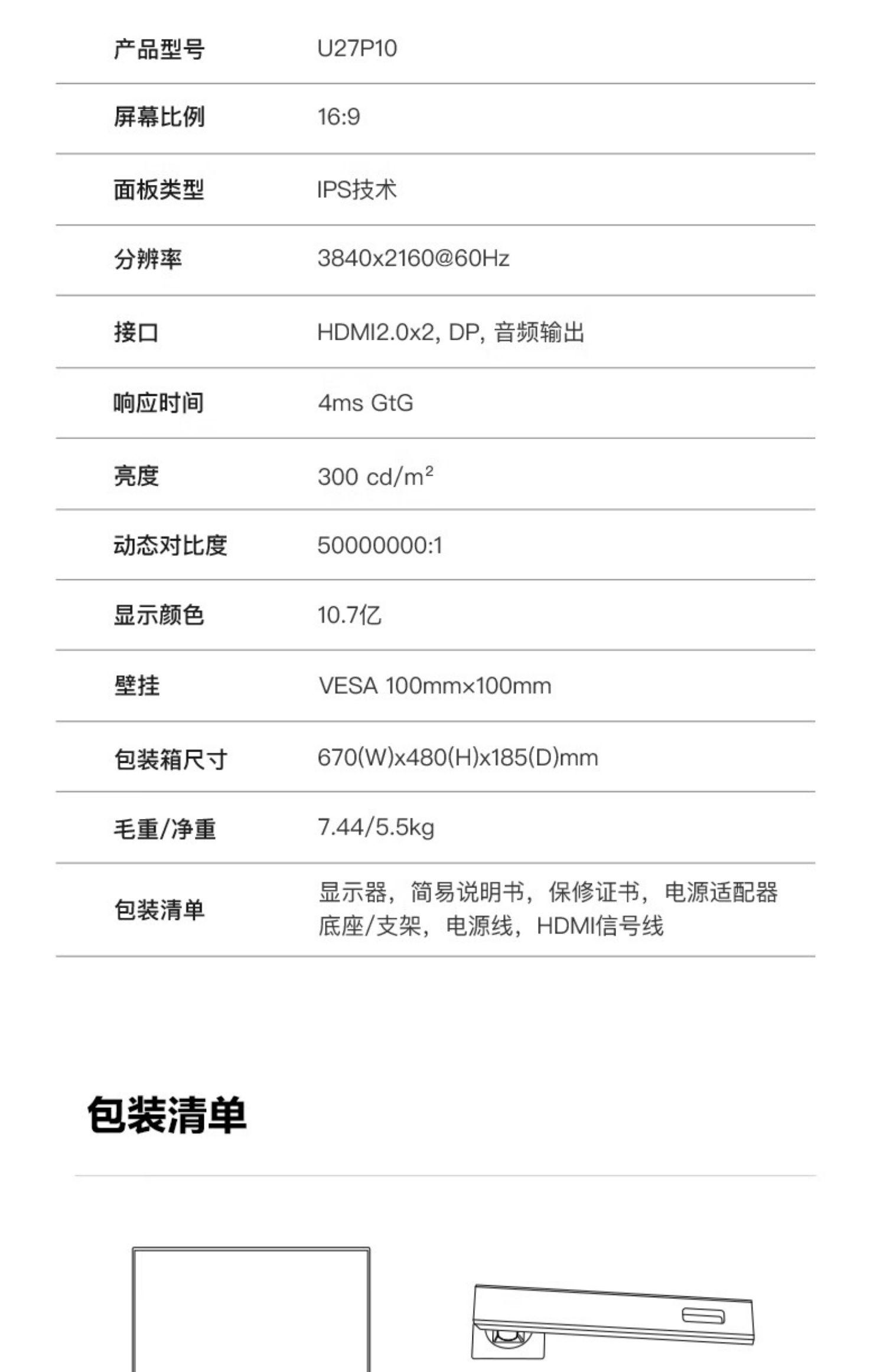 灰阶响应时间:4毫秒颜色分类:U27P10 【4K IPS屏支持升降旋转】 U27P2C【4K超清/旋转升降】 Q27P2C【2K分辨率/旋转升降】 Q27P10【2K分辨率/旋转升降】生产企业:冠捷电子科技(福建)有限公司