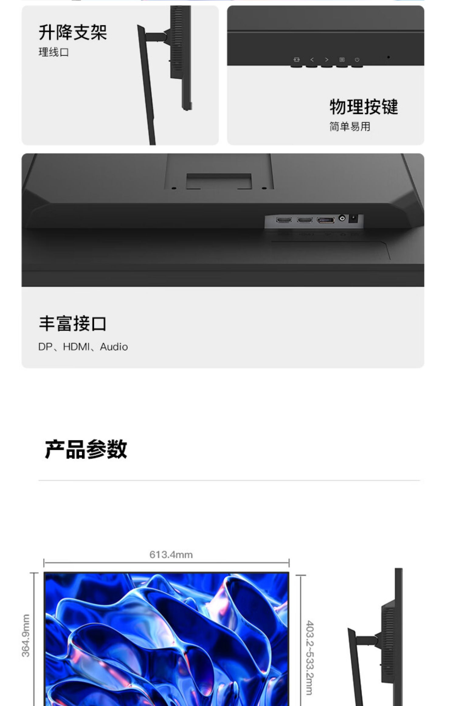 屏幕比例:16:9接口类型:HDMI DP垂直可视角度:178°